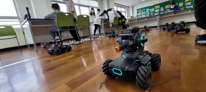 2인1조로 인공지능 로봇(로보마스터 S1)을 협의하며 블럭코딩을 진행하고 있어요.