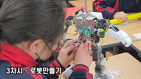 | 3교시 | 로봇 만들기 | 로봇 디자인 제작(로봇 외형 디자인 제작) 로봇 조립(컨트롤 보드 + 서보 + 뼈대 조립) 로봇 조작 및 체험 |