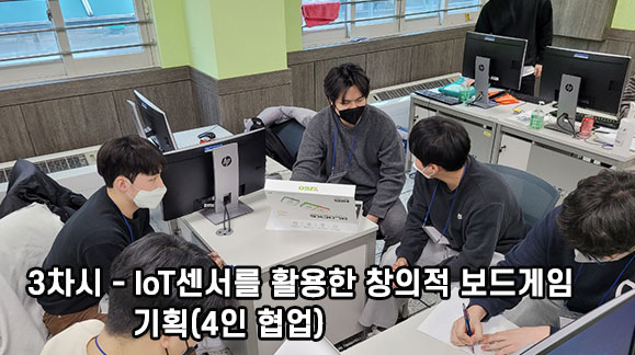 | 3교시 | IoT 센서를 활용한 창의적 보드게임 기획(4인 협업) | 센서가 적용된 보드게임 기획 보드게임의 규칙 및 창의적 보드 디자인 기획 |