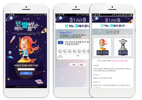 초, 중, 고교 대상 인성교육 체험활동으로 성향검사 앱(넌 어느 별에서 왔니?)을 통한 간단한 검사로 자신의 성향에 맞는 캐릭터를 직접 만들어 볼 수 있으며, 자신과 친구의 성향 스티커 붙이기 활동으로 서로를 비교해 볼 수 있는 등 모든 활동이 체험형으로 만들어진 인성교육 프로그램입니다.