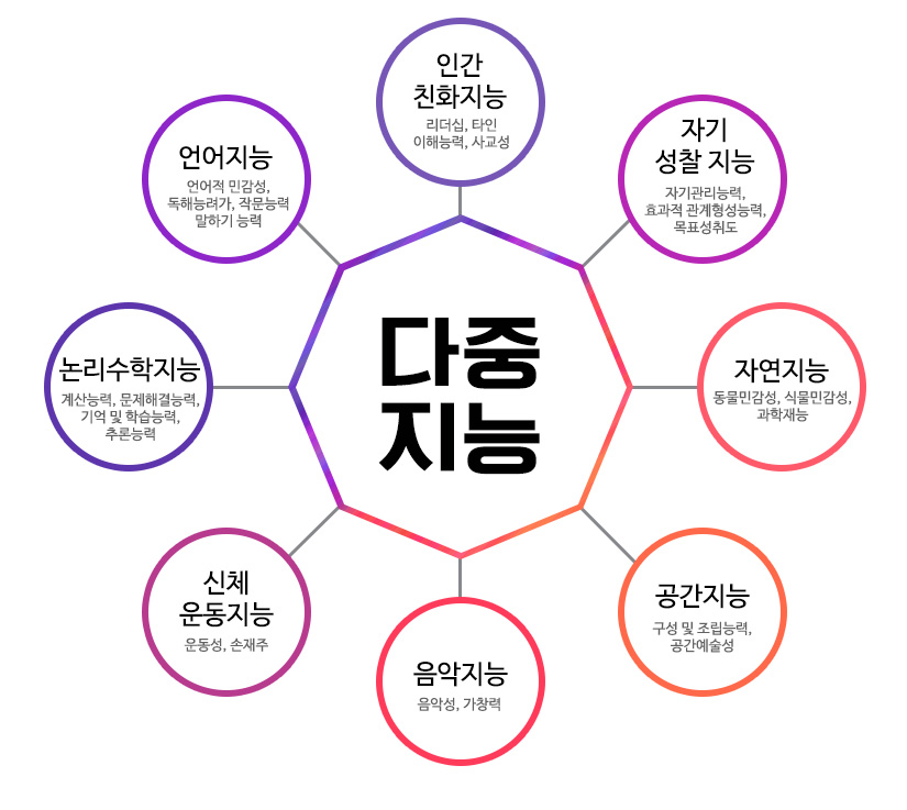 인간의 지적 능력이 서로 독립적이며 상이한 여러 유형의 능력으로 구성된다는 가드너(H. Gardner)의 지능 이론 인간의 지능은 언어, 음악, 논리수학, 공간, 신체운동, 대인관계, 자기이해, 자연친화지능과 같이 독립된 8개의 지능으로 구성된다. 이 다양한 지능의 조합으로 수많은 재능의 발현이 이뤄진다. |