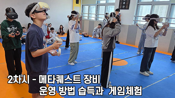 | 2교시 | 메타퀘스트 장비 운영 방법 습득과 게임 체험 | 기기 운영방법을 게임형 투트리얼 앱을 통해 습득하고 게임을 통해 조작방법을 익힌다 |